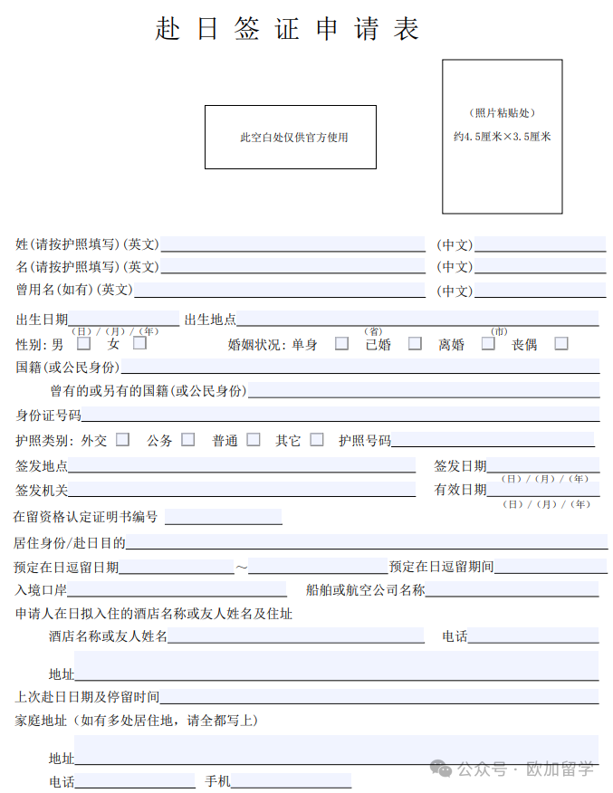 1. 签证申请表(贴付照片 竖4.5cm×横3.5cm,白底,1张,提交6个月内拍摄的)